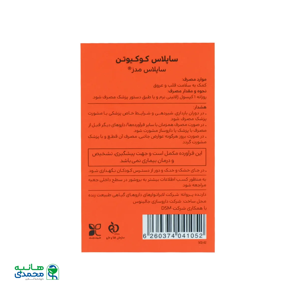 کپسول ساپلاس کوکیوتن ساپلاس مدز حاوی CoQ10 و روغن سبوس برنج است.