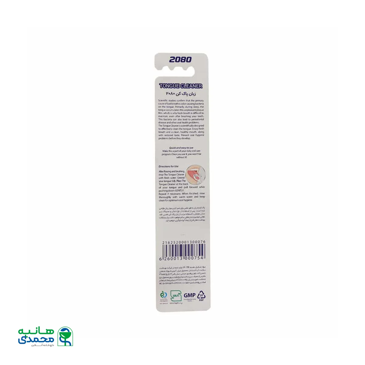 زبان پاک کن 2080 با طراحی حرفه ای و به طور علمی به بهداشت دهان و دندان کمک می‌کند و باعث حذف پلاک‌ها و باکتری‌های جمع شده روی زبان می‌شود که می‌تواند از بوی بد دهان جلوگیری کند. پس از استفاده از نخ دندان و مسواک زدن دندان‌هایتان با استفاده مرتب از زبان پاک کن 2080 نفسی تازه، دهانی خوشبو و دندان‌هایی سالم خواهید داشت و از مشکلات بهداشت دهان قبل از ایجاد آنها جلوگیری خواهید کرد. در کنار استفاده از زبان پاک کن، خرید مسواک و نخ دندان باکیفیت به سلامت و حفظ بهداشت دهان و دندان کمک می‌کند.