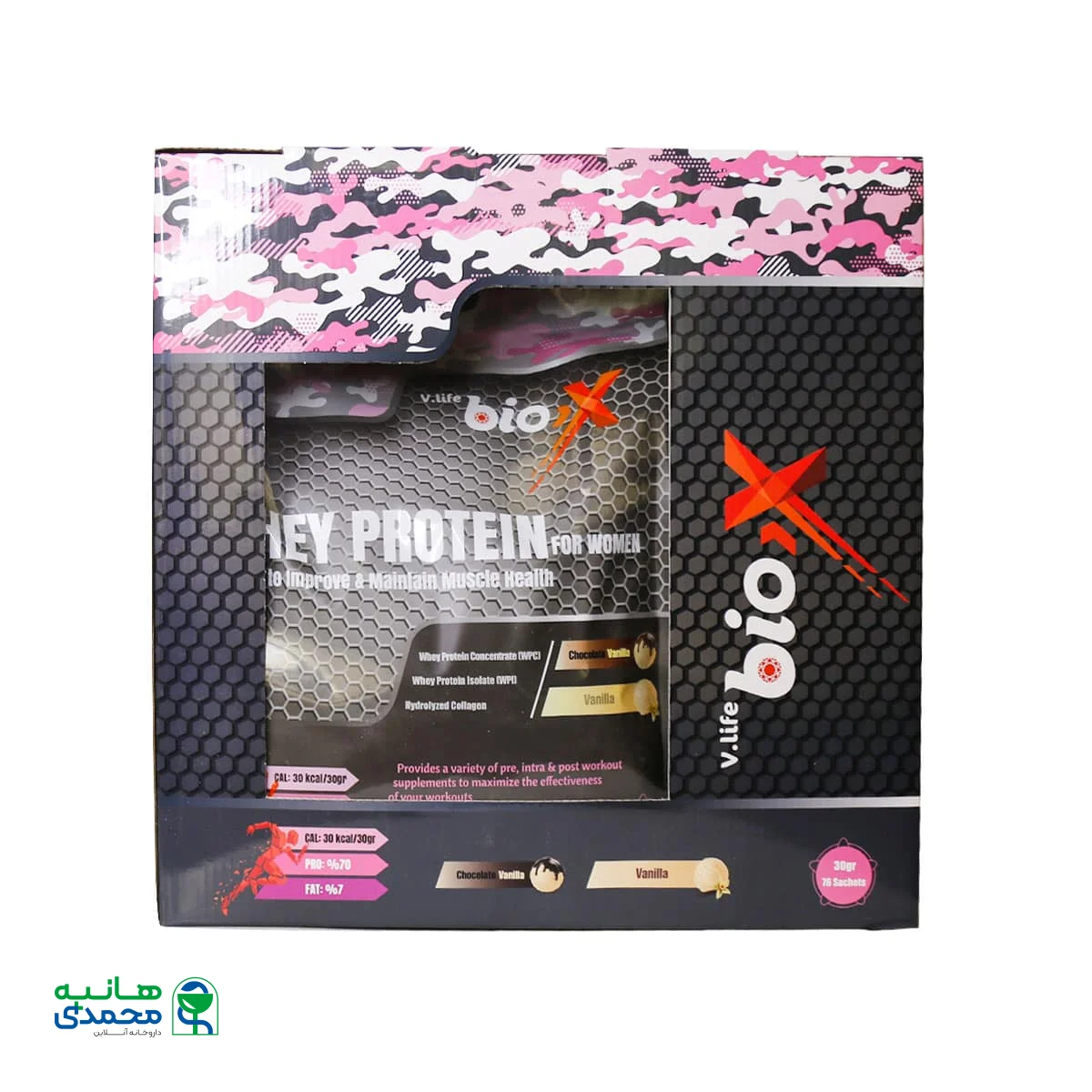 پودر وی پروتئین بانوان وی لایف بایوکس با فرمولاسیون منحصر به فرد و در 76 عدد ساشه در دو طعم جهت عضله سازی، کاهش وزن و سلامت پوست استفاده می‌شود.