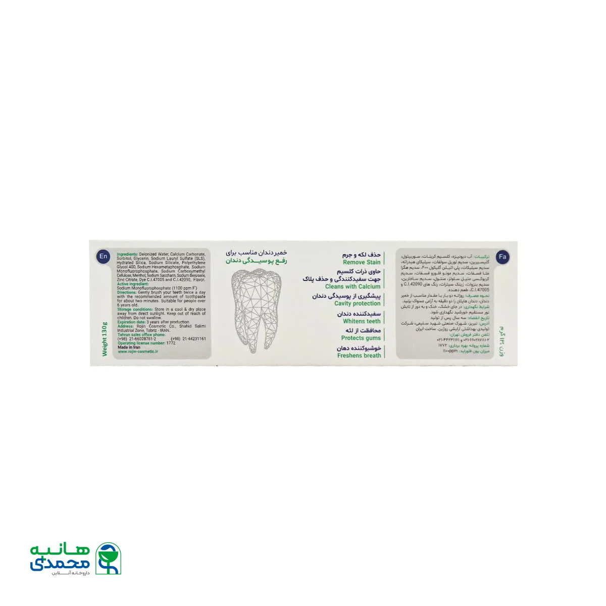 آب دیونیزه، کلسیم کربنات، سوربیتول، گلیسیرین، سدیم لوریل سولفات، سیلیکای هیدراته، سدیم سیلیکات، پلی اتیلن گلیکول 400، سدیم هگزا متا فسفات، سدیم مونو فلورو فسفات، سدیم کربوکسی متیل سلولز، منتول، سدیم ساخارین، سدیم بنزوات، زینک سیترات، رنگهای CI42090 و CI47005، طعم دهنده