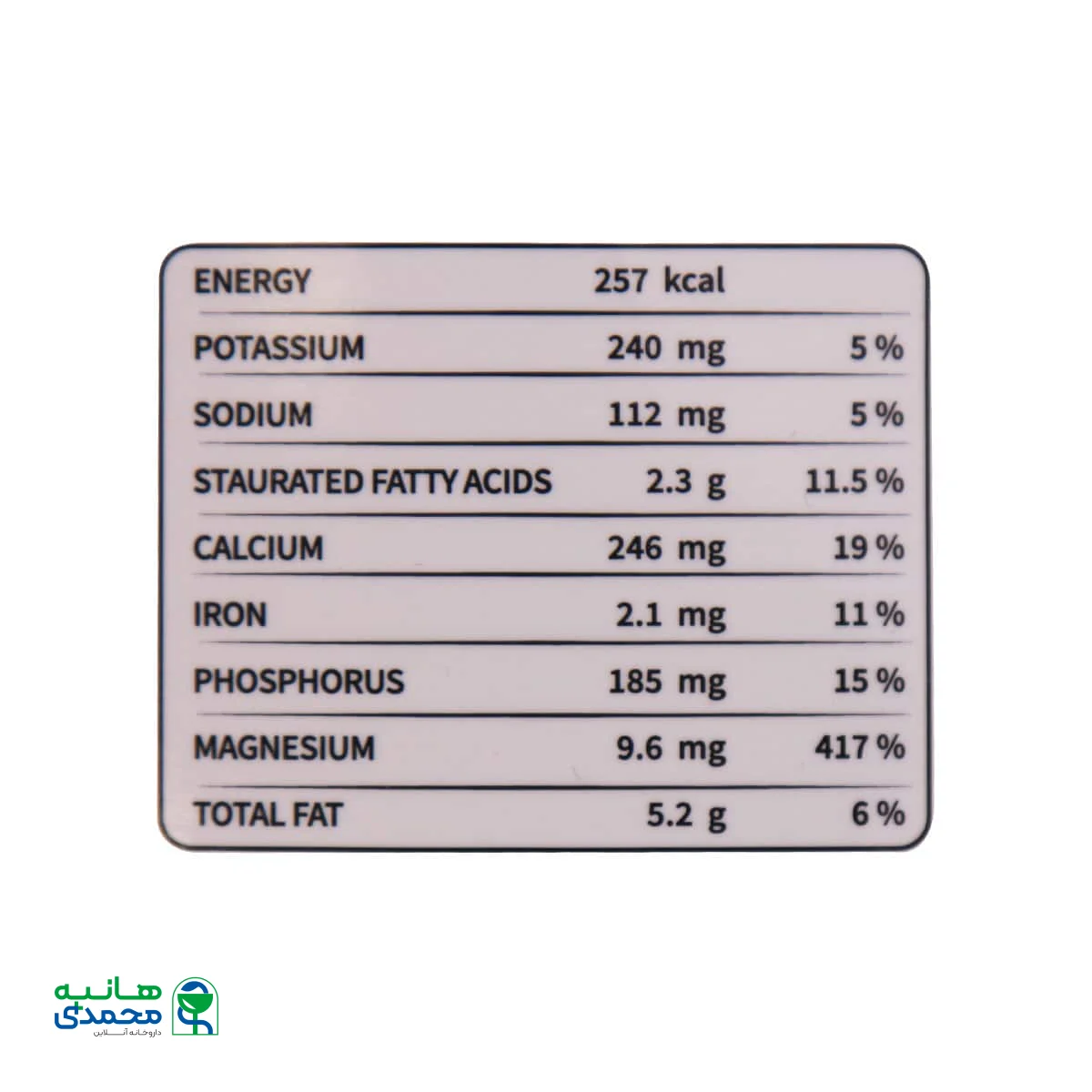 | منیزیم | 9.6mg | 417% |