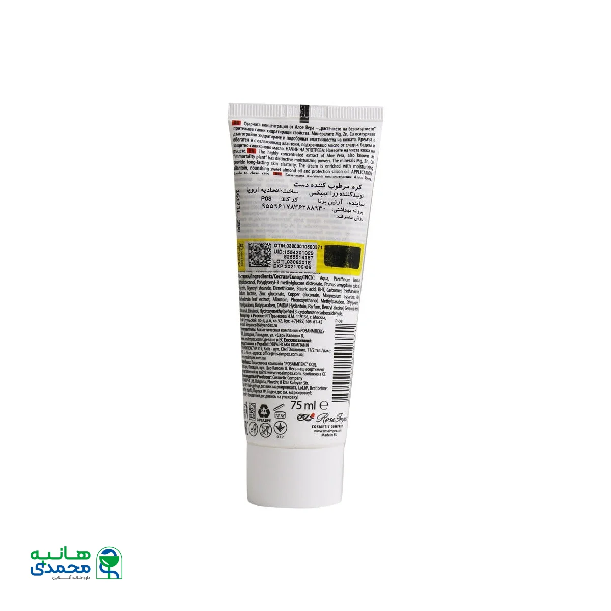 کرم مرطوب کننده دست پرستیژ حاوی آلوئه‌ورا، مواد معدنی منیزیم، روی و مس می‌باشد. پوست دست را رطوبت رسانی کرده و خشکی و احساس کشیدگی پوست را برطرف می‌کند.