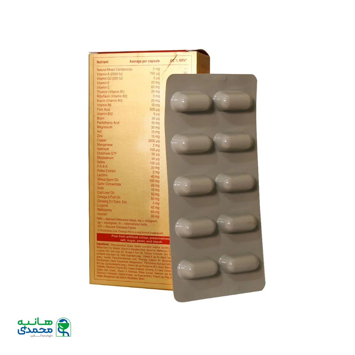 کپسول امگا اچ 3 ویتابیوتیکس شامل امگا 3 و روغن کبد ماهی به همراه 33 عنصر بیولوژیکی یک منبع متعادلی از مواد غذایی ضروری را فراهم می‌کند که برای سلامت عمومی بدن لازم است.