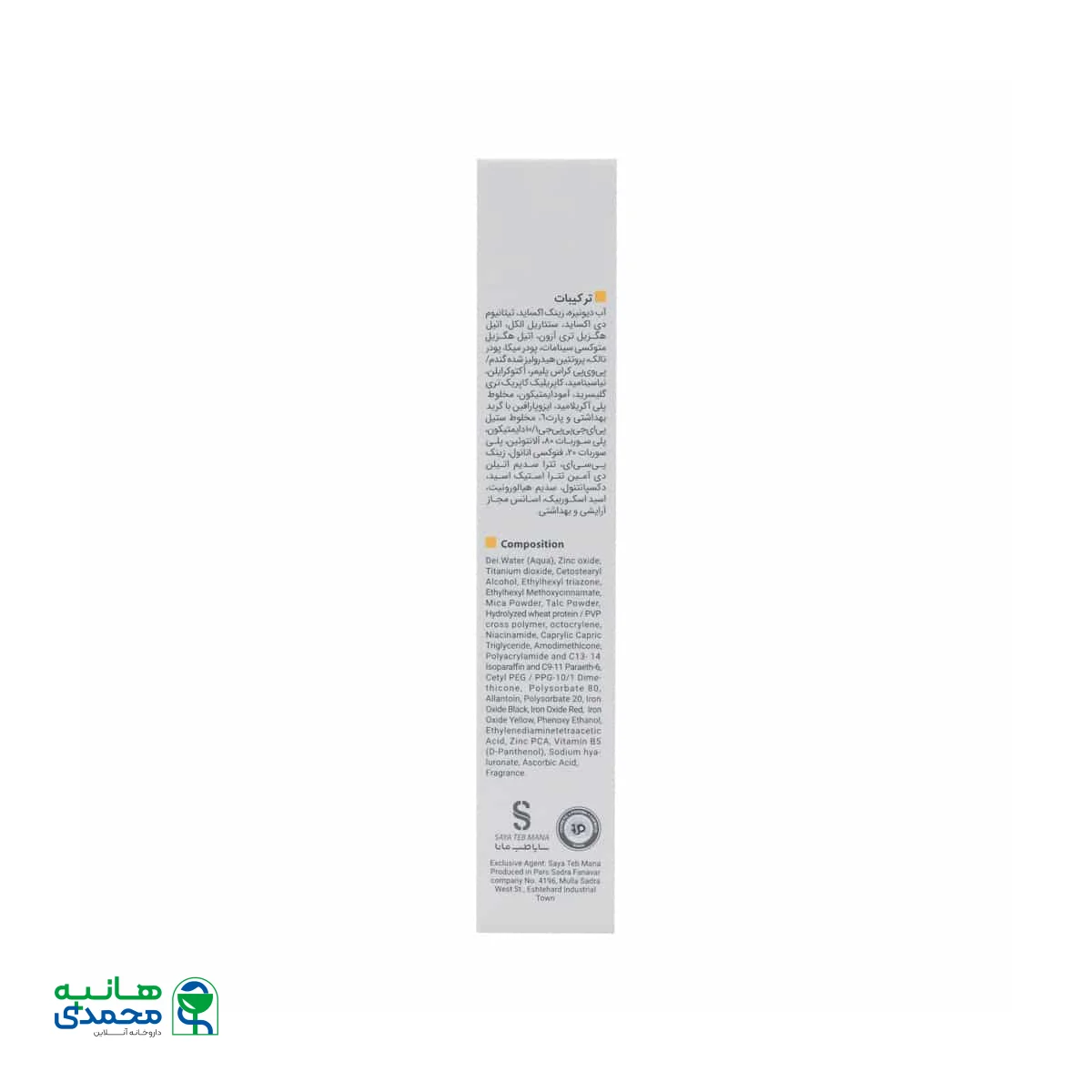 آب دیونیزه، زینک اکساید، تیتانیوم دی اکساید، ستئاریل الکل، اتیل هگزیل تری آزون، اتیل هگزیل متوکسی سینامات، پودر میکا، پودر تالک، پروتئین هیدرولیز شده گندم، پی وی پی کراس پلیمر، آکتوکرایلن، نیاسینامید، کاپریلیک کاپریک تری گلیسرید، آمودایمتیکون، مخلوط پلی آکریلامید، ایزوپارافین با گرید بهداشتی و پارت 6، مخلوط متیل پی ای جی پی پی جی 1/10 دایمتیکون، پلی سوربات 80، آلانتوئین، پلی سوربات 20، فنوکسی اتانول، زینک پی سی ای، تترا سدیم اسید، دکسپانتنول، سدیم هیالورونیت، اسید اسکوربیک، اسانس مجاز آرایشی و بهداشتی.