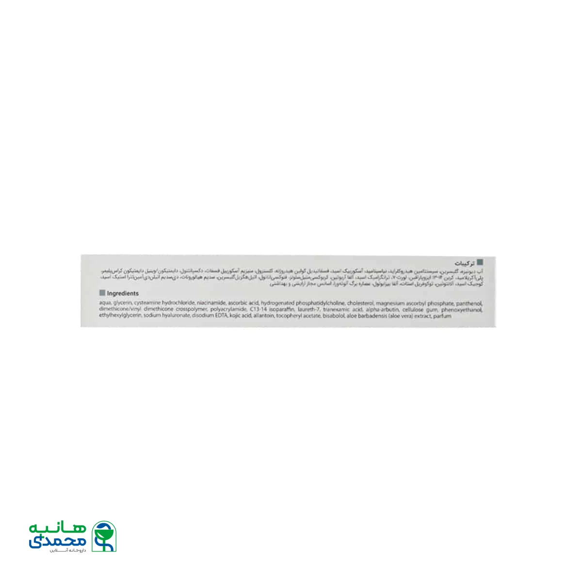 • حاوی سیستئامین لیپوزومال، آربوتین، نیاسینامید و ترانگزامیک
