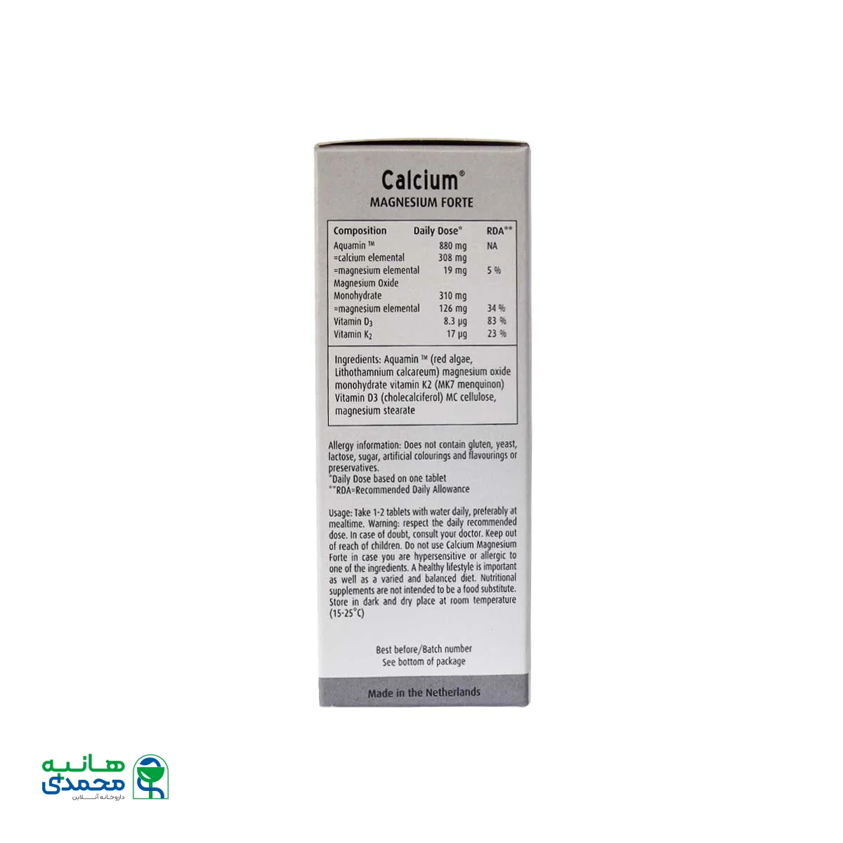 قرص کلسیم منیزیم فورت ویتالایز بر اساس جدیدترین یافته‌های علمی فرموله شده است. این محصول یک فرمول ۱۰۰ ٪ طبیعی برای نگهداری از استخوان‌ها است. یک ماده معدنی گیاهی دریایی است که از جلبک قرمز به دست آمده و سرشار از کلسیم بوده و همراه با قابل جذب ترین فرم منیزیم، ویتامین D3 (کلکلسیفرول) و ویتامین MK-7K2 است که باعث نتایج مطلوب این فراورده می‌شود. جهت مشاهده قیمت و خرید کلسیم به دسته بندی مربوطه در داروخانه آنلاین دکتر هانیه محمدی مراجعه کنید.