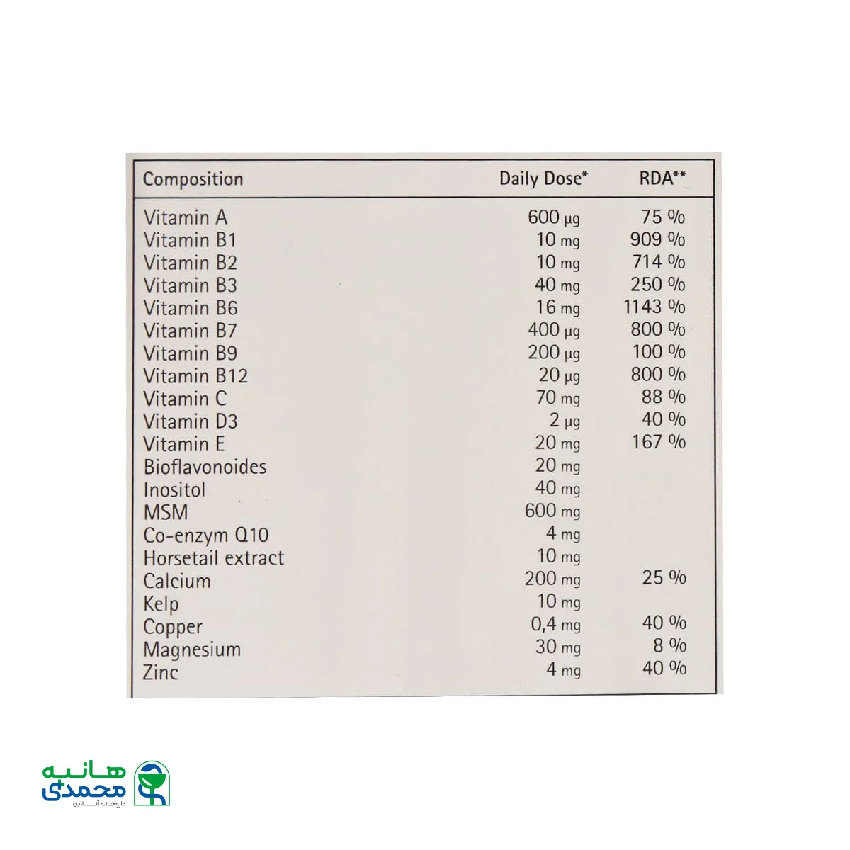 متیل سولفونیل متان، کلسیم کربنات، سلولز MC، بیوتین، اسکوربیک اسید، اکسید منیزیم، سیلیکون دی اکسید، اینوزیتول، استئارات منیزیوم، نیکوتینامید، توکوفرول اسید سوکسینات، پیریدوکسین HCL، هیپروملوز، تیامین هیدروکلراید، سیتروس بیوفلاونویید، زینک سیترات،کلپ (اشنه دریایی) عصاره گیاه دم اسب، ریبوفلاوین، رتینول پالمیتات، کوانزیم Q10، تیتانیم دی اکسید، اکسید آهن، تالک، پلی سوربات، موم زنبور عسل، موم کارنوبا، گلوکونات مس، ویتامین D3، سیانوکوبولامین و اسید فولیک