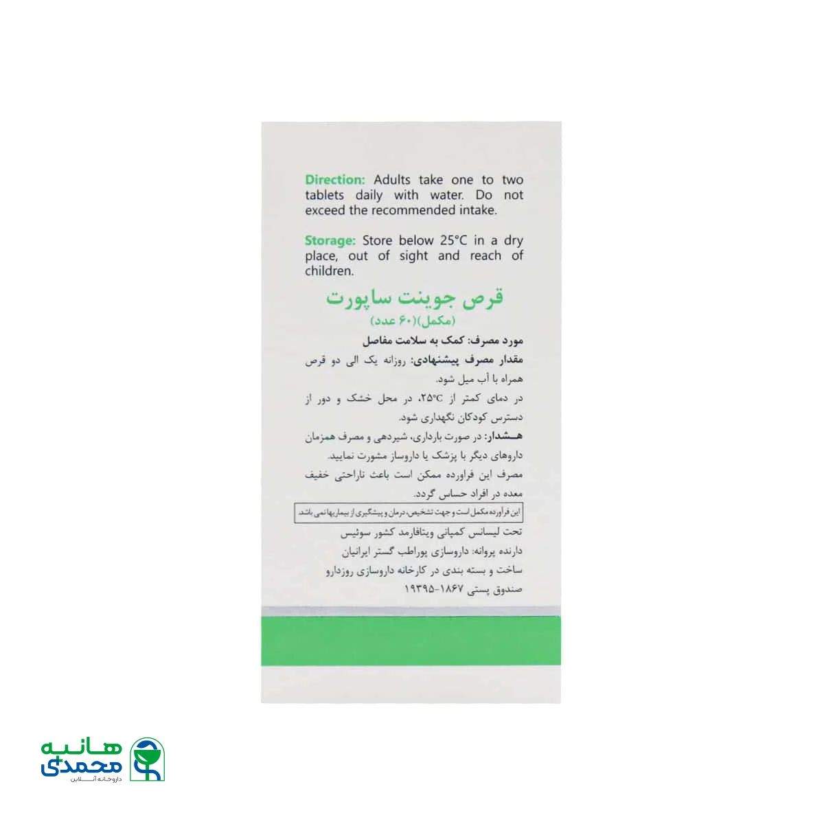 قرص جوینت ساپورت مکمل تغذیه‌ای بوده و جهت تشخیص، درمان و پیشگیری از بیماری‌ها نیست.
