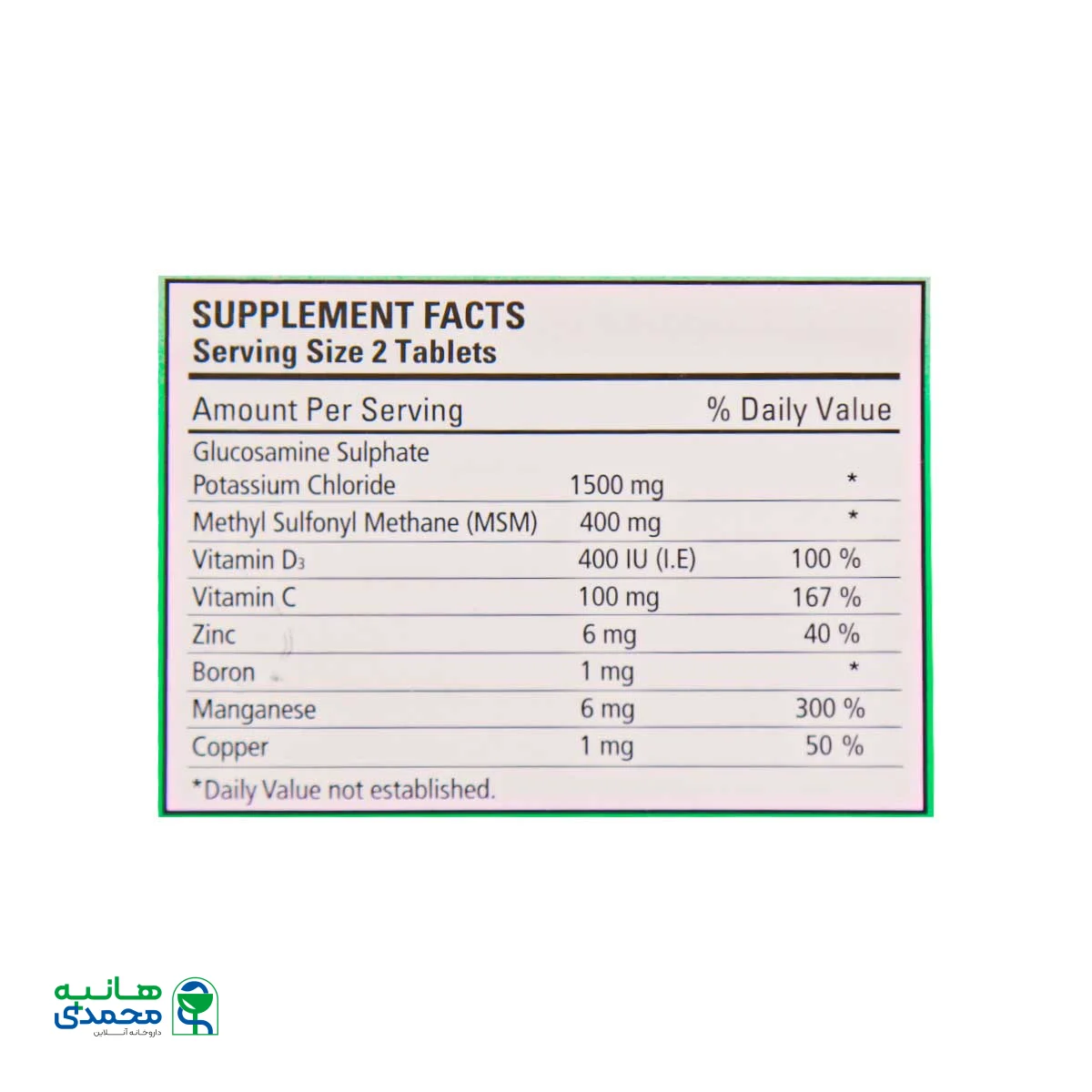 • حاوی گلوکزامین، ام اس ام، ویتامین‌های D3 و C، روی، بور، منگنز و مس
