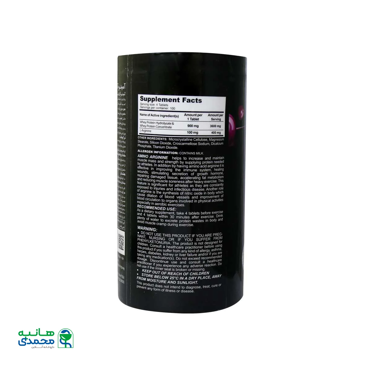 پروتئین وی هیدرولیز و وی کنسانتره، ال آرژنین، میکروکریستالین سلولز، منیزیم استئارات، سیلیکون دی اکسید، کراس کارملوز سدیم، دی کلسیم فسفات، تیتانیوم دی اکسید