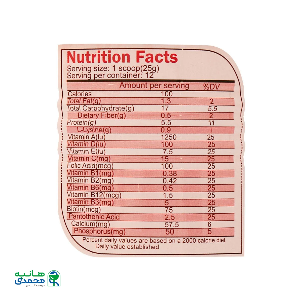 2-5 سال: یک پیمانه (25 گرم) در 70 میلی لیتر آب، یک بار در روز میل نمایید.