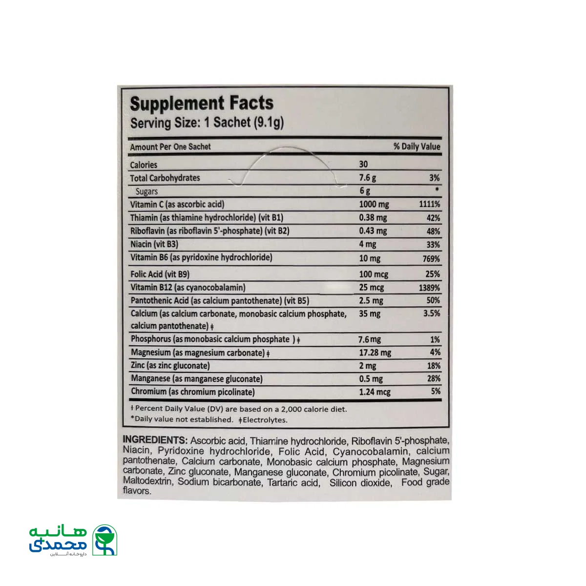 اسید آسکوربیک، تیامین هیدروکلرید، ریبوفلاوین 5-فسفات، نیاسین، هیدروکلرید پیریدوکسین، فولیک اسید، سیانوکوبالامین، کلسیم پنتوتنات، کربنتات کلسیم، مونو کلسیم فسفات، کربنات منیزیم، گلوکونات روی، گلوکونات منگنز، پیکولینات کروم، شکر، مالتودکسترین، سدیم بی کربنات، تار تاریک اسید، دی اکسید سیلیکون، طعم مجاز خوراکی