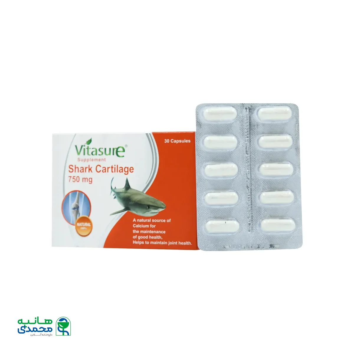 کپسول شارک کارتیلاج 750 میلی گرم ویتاشور یکی از محصولات دارویی است که در سلامت استخوانها، غضروفها و مفاصل تاثیر چشمگیری دارد. این مکمل با فرمولاسیون منحصر به فرد خود قادر است تا به درمان خشکی استخوانها و مفاصل پرداخته و در نهایت از بروز بیماریهایی نظیر آرتروز جلوگیری نماید. همچنین کپسول شارک کارتیلاژ قادر است به بهبود حرکت و جلوگیری از تخریبهای غضروفی و استخوانی بپردازد. به علاوه با دارا بودن خاصیت ضد التهابی از بروز هرگونه مشکل در سالمندان و بیماران دارای مشکلات مفصلی جلوگیری نماید. نا گفته نماند این مکمل که به عنوان بهترین قرص برای زانو درد شناخته شده است، هیچ گونه شکر، لاکتوز، نشاسته، گلوتن، مخمر، نمک، رنگ و طعم دهندههای مصنوعی در ترکیبات خود ندارد.