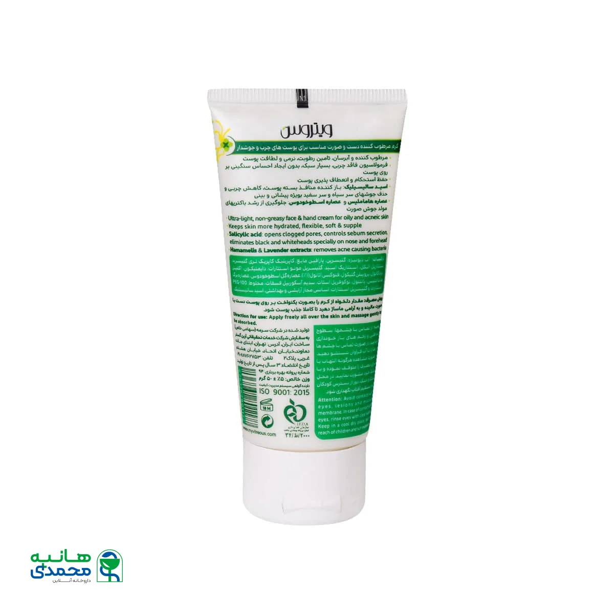 کرم مرطوب کننده تیوبی دست و صورت پوست چرب ویتروس دارای فرمولاسیون بسیار سبک و فاقد چربی است. در زمان خرید کرم مرطوب کننده دست برخی نگران ایجاد چربی محصول روی پوستشان هستند. اما فاقد چربی بودن محصول باعث شده تا در زمان استفاده از آن بدون ایجاد حس سنگینی بر روی پوست، رطوبت مورد نیاز دست و صورت تامین شود. خاصیت افزایش استحکام و انعطاف پذیری پوست از دیگر ویژگیهای کرم مرطوب کننده و آبرسان پوست چرب ویتروس است. این کرم دست با دارا بودن اسید سالیسیلیک بازکننده منافذ بسته بوده و سبب کاهش چربی و حذف جوشهای سر سیاه و سر سفید به ویژه در بینی و پیشانی میشود. ترکیبات گیاهی همچون عصاره هاماملیس و عصاره اسطوخودوس نیز در این کرم مرطوب کننده به کار رفته است. این سری مواد با خواص بی نظیر خود از رشد باکتریهای مولد جوش صورت جلوگیری نموده و پوستی صاف و لطیف را موجب میشوند.