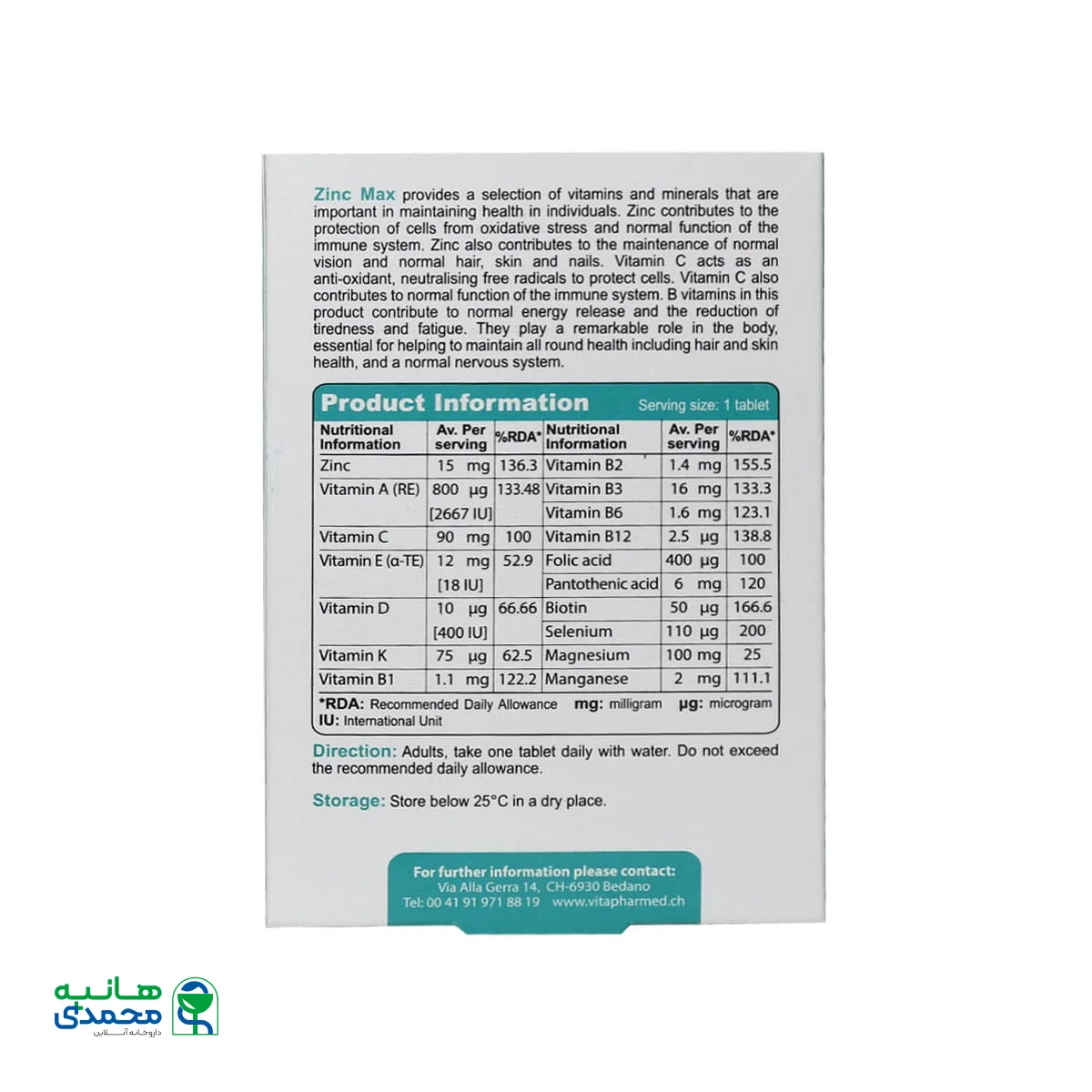 روزانه یک عدد قرص Zinc Max ویوا تیون همراه با آب میل شود.