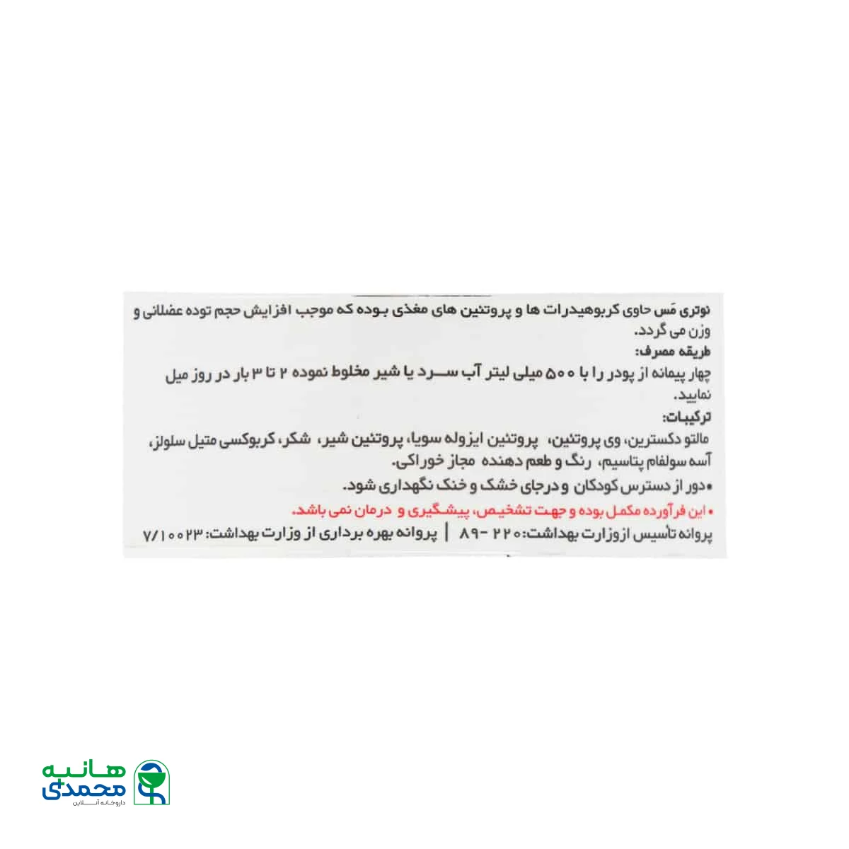 پودر نوتری مس ویثر با طعم دلچسب شکلات، سرشار از پروتئین‌های مغذی و کربوهیدرات بوده که افزایش حجم توده عضلانی و وزن را به دنبال دارد.