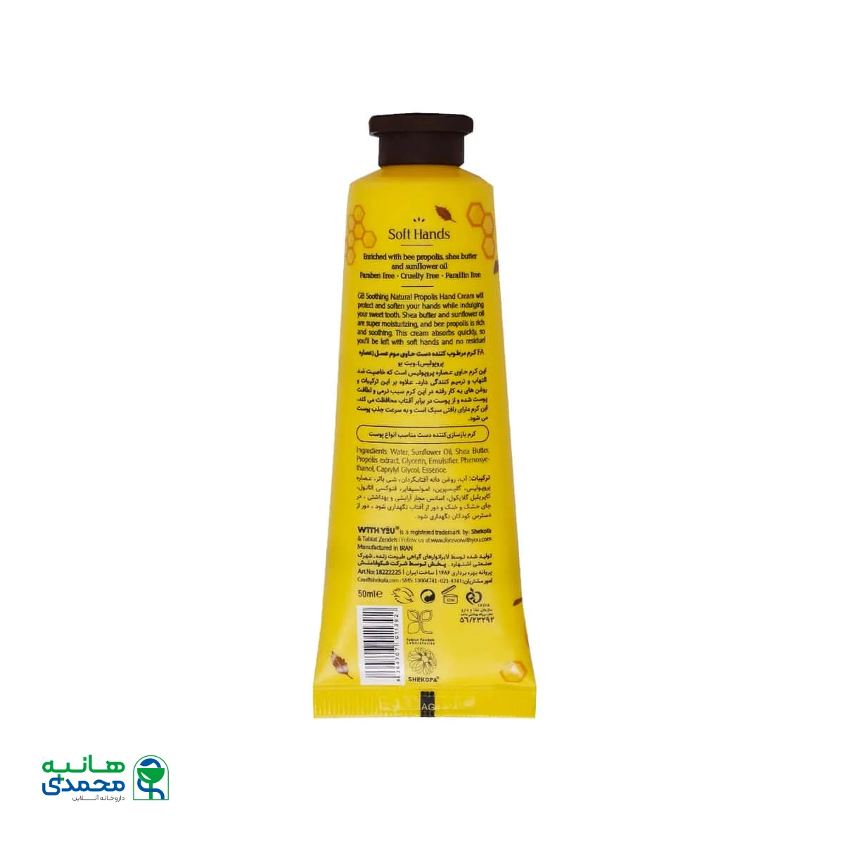 آب، روغن دانه آفتاب گردان، شی باتر، عصاره پروپولیس، گلیسیرین، امولسیفایر، فنوکسی اتانول، کاپریلیل گلایکول، اسانس مجاز آرایشی و بهداشتی.