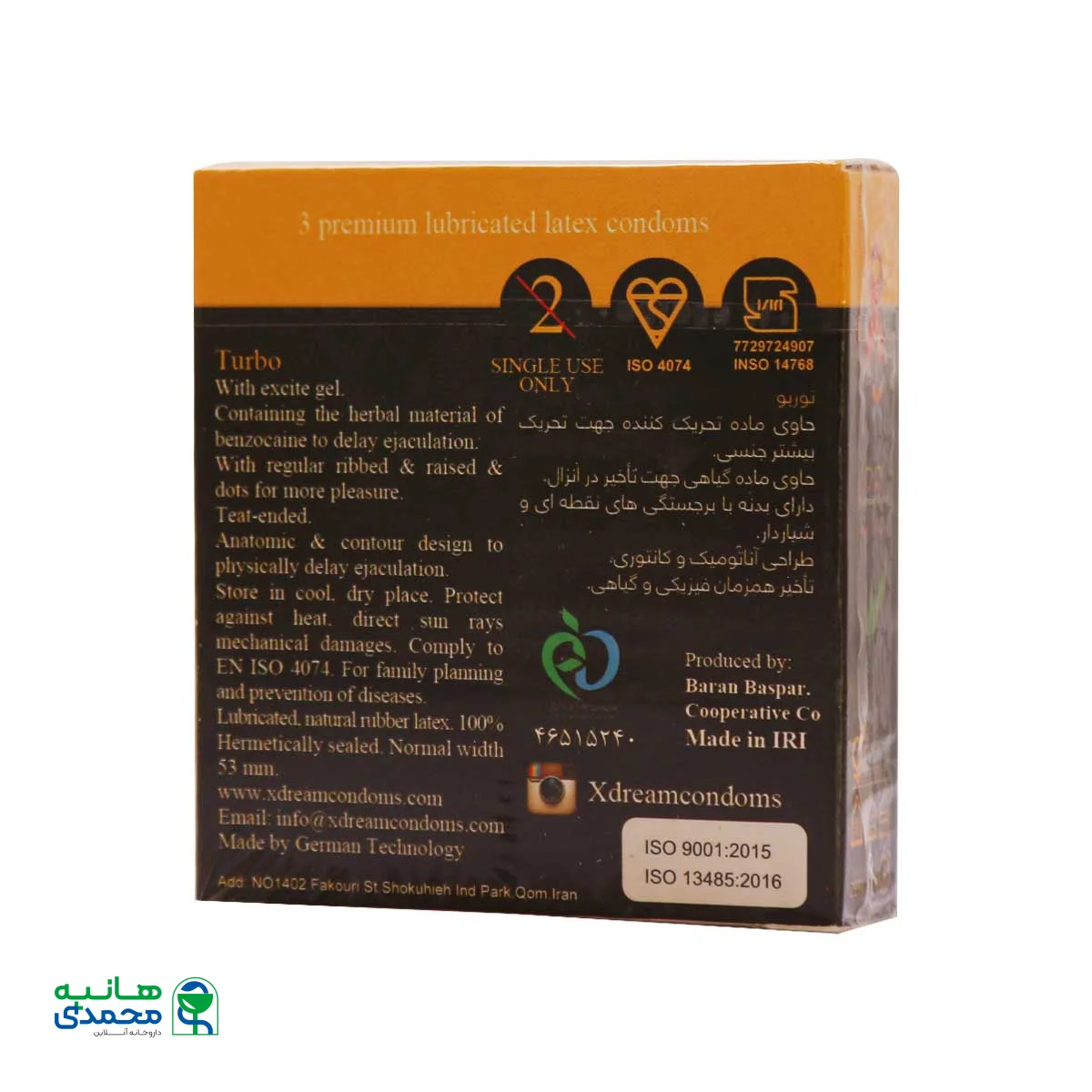 شما میتوانید در هر کجای کشور با خیال راحت و اطمینان از اصالت و کیفیت کالا، اقدام به خرید انواع محصولات زناشویی مانند کاندوم ایکس دریم مدل توربو از داروخانه آنلاین دکتر هانیه محمدی نمایید و مرسوله را به صورت کاملا محرمانه درب منزل یا محل کار تحویل بگیرید. خرید آنلاین از دکتر هانیه محمدی مزایایی مانند صرفه جویی در زمان، تخفیفات ویژه، ارسال به موقع، بهره گیری از تجربیات دیگران و … را به دنبال دارد.