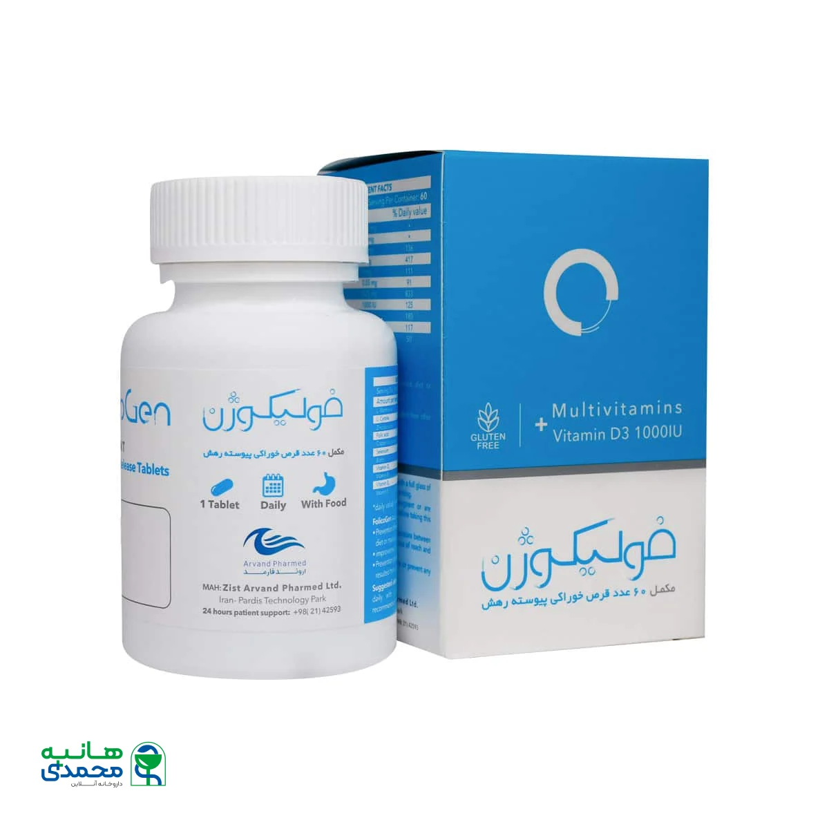 قابل ذکر است که هر بسته مکمل فولیکوژن اروند فارمد حاوی 60 عدد قرص است. فولیکوژن به صورت قرص پیوسته رهش است و در مدت زمانی طولانیتر در معده آزاد میشود؛ بنابراین موجب کاهش دفعات مصرف شده و از نظر اقتصادی به صرفه است.