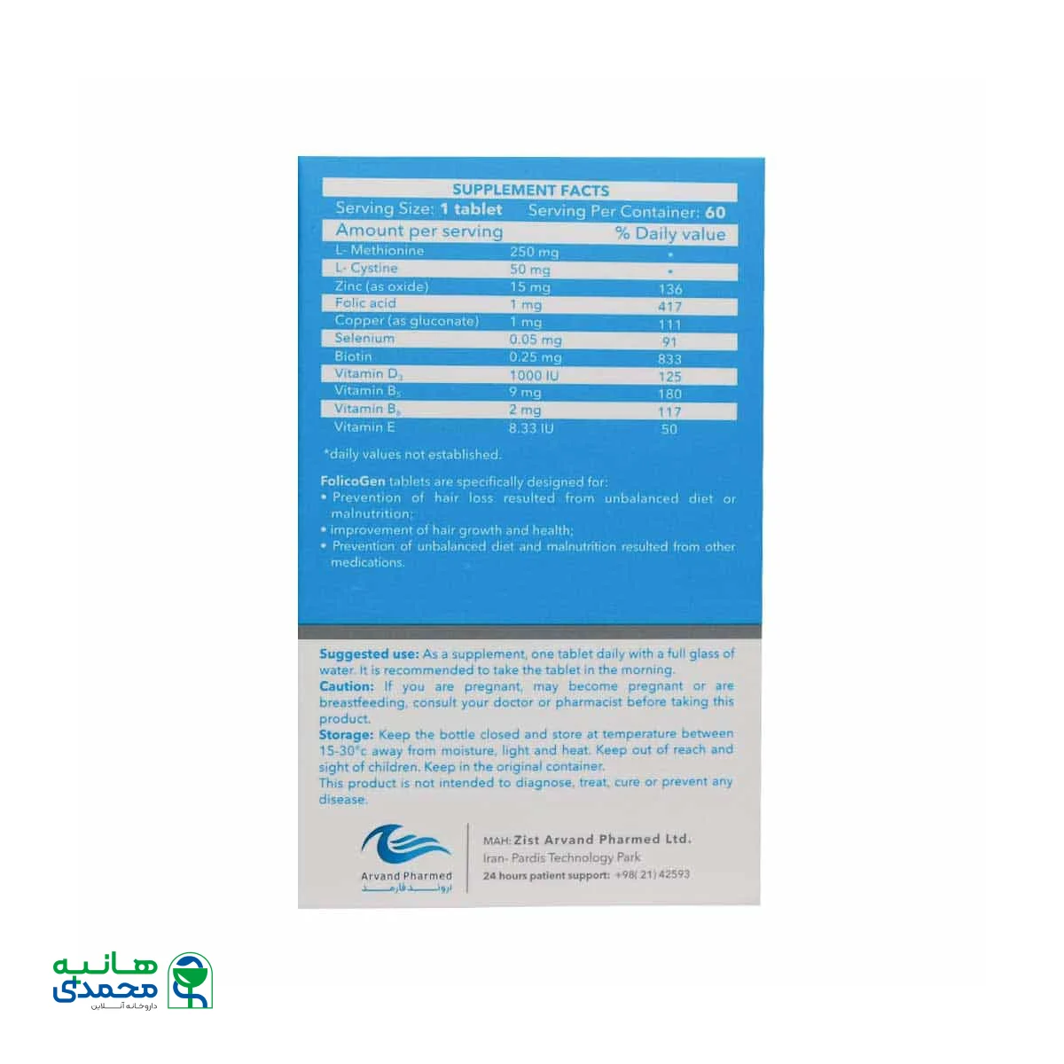 فولیکوژن محصول شرکت اروند فارمد ایران بوده و در بستهبندی 60 تایی تولید و عرضه شده است.