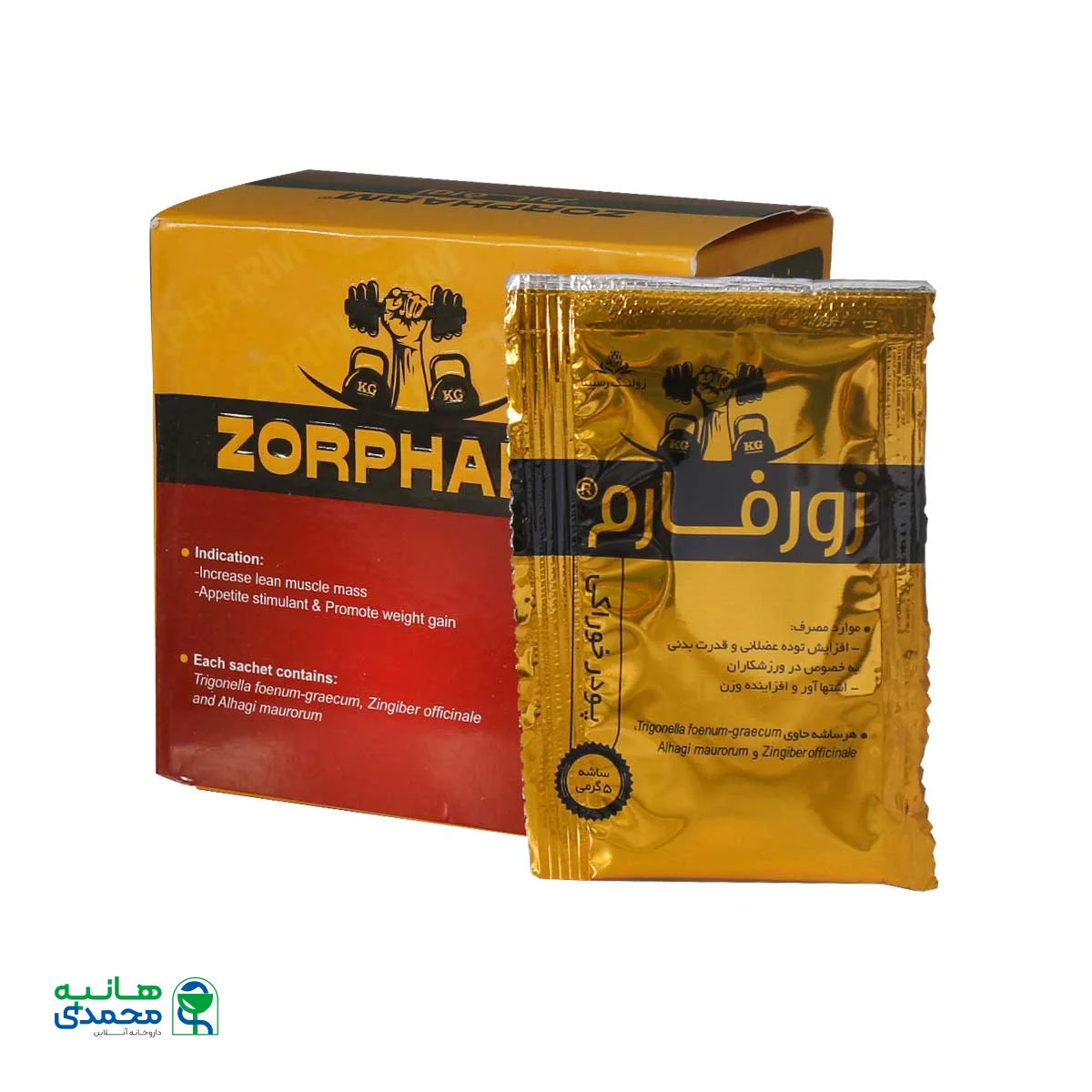 هر ساشه زورفارم حاوی 5 گرم مخلوط پودرهای دانه شنبلیله، ریزوم زنجبیل و مان ترنجبین است.